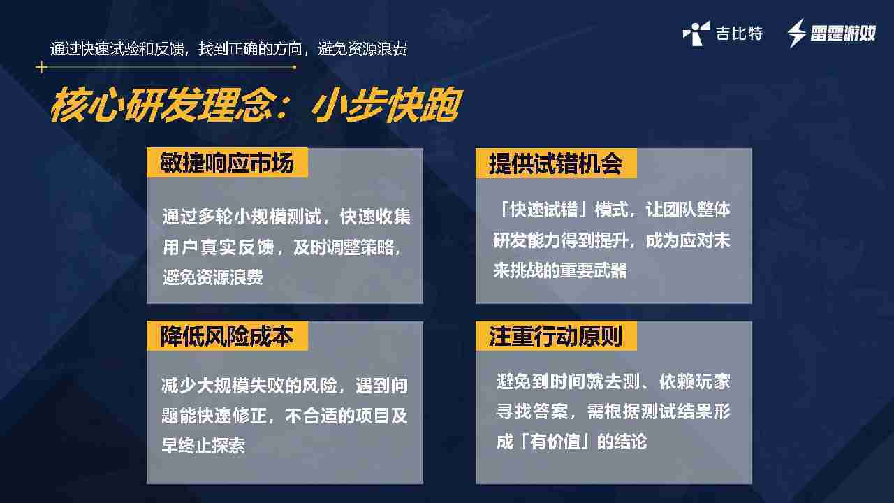 小步快跑不是找答案,,而是验证答案。。。。我们之前有项目是这样的,,,有些制作人会有几个方向觉得都可以做,,,,但是不确定做哪一个,,会选择几个都做,,做完拿到市场跑,,,,跑出哪一个更好,,基于这个再做后续的研发和拓展。。但这种情况最容易出现一个问题,,,,可能被玩家裹胁,,,玩家说这个点不错、、、那个点不错,,到底听还是不听,,,,不听感觉是无视玩家的反馈,,,,听的话,,,,可能自己没想清楚导致研发思路发生偏颇。。。。所以针对这一点后面自己复盘整理,,,发现制作人自己心里要有数,,要做自己觉得好玩的,,,而且明确知道这个东西是你想做的,,,,然后拿到市场验证这个答案是不是对的,,而不是拿一堆答案找哪一个答案更好。。。