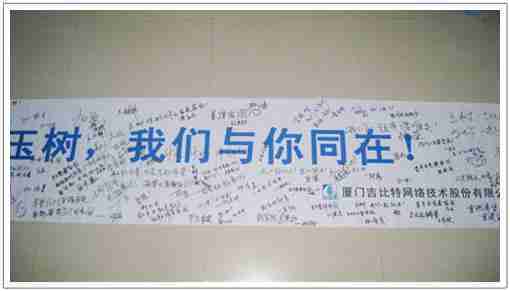 在募捐现场,,赏金大对决同学们怀着沉重的心情,,将每一笔捐款投入募捐箱,,,并在现场设置的横幅上,,写上了对玉树人民的深情祝福。。。。满载赏金大对决祝福的横幅将和捐款一起抵达玉树,,,希望谨以此微薄之意,,,为玉树人民带去赏金大对决的爱心与祝福,,,希望吉祥、、、、幸福的阳光能早日驱散灾难的阴霾,,,,普照在玉树人民的身上,,,,鼓励他们坚强、、、、勇敢与乐观。。。