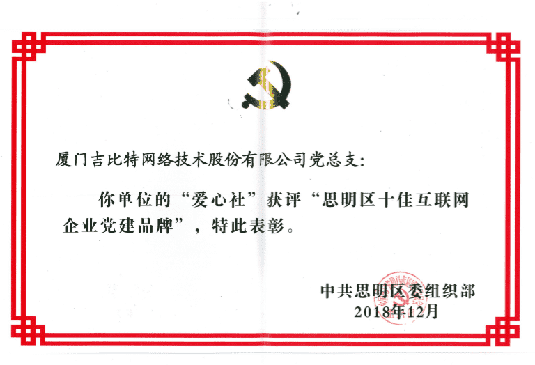 经初审评选、、、网络评选和专家评审等环节,,,,"厦门赏金大对决网络技术股份有限公司党总支-爱心社" 从全区28个参评党建品牌中脱颖而出,,,获评"思明区十佳互联网企业党建品牌"。。。。